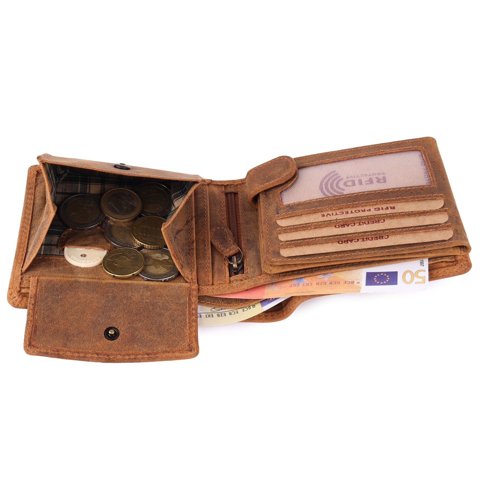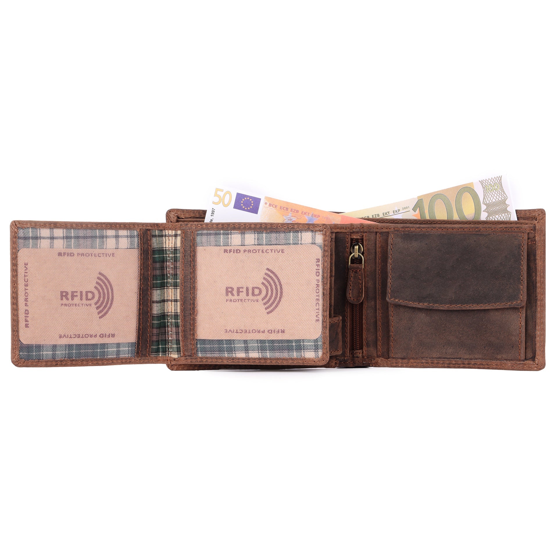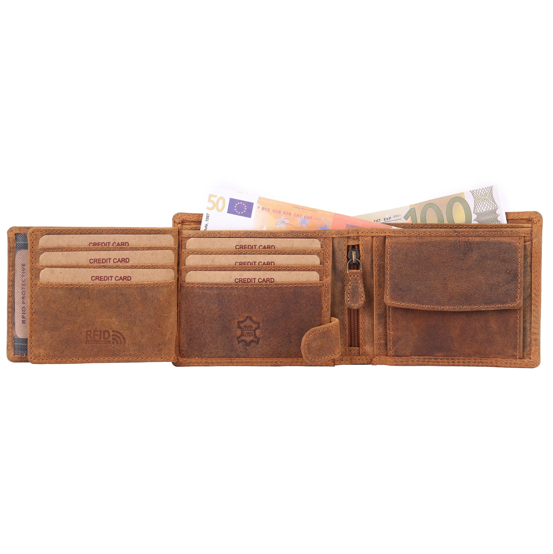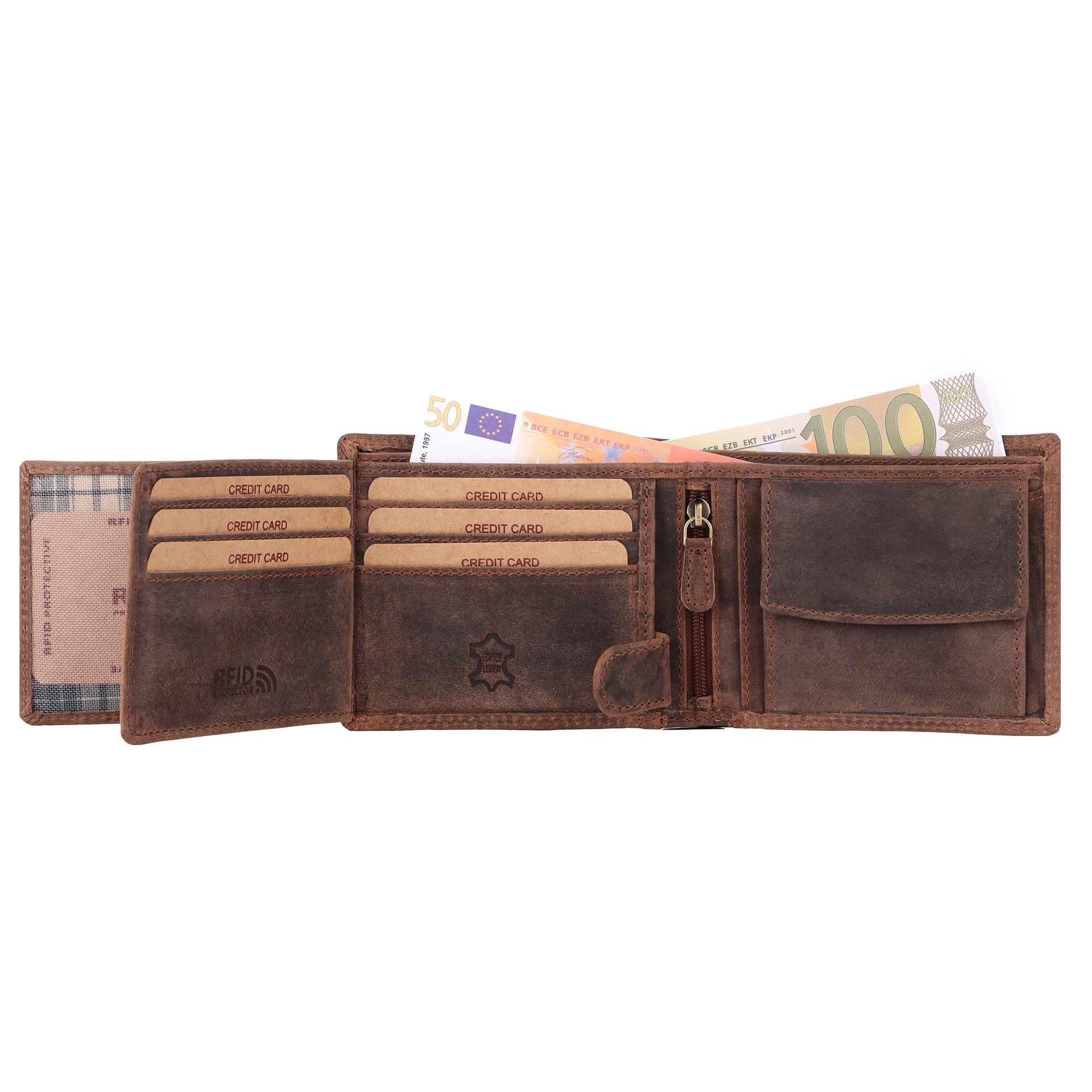 · Herren-Geldbörse - Sehr angenehmes weiches Leder, ein Tolles Material im leichten Vintage-Look. Ein echt hochwertiges Portemonnaie - durch das Langlebige Echt Leder werden Sie den unterschied fühlen. Inklusive RFID-Schutz ist die Börse sicher gegen Datenraub.