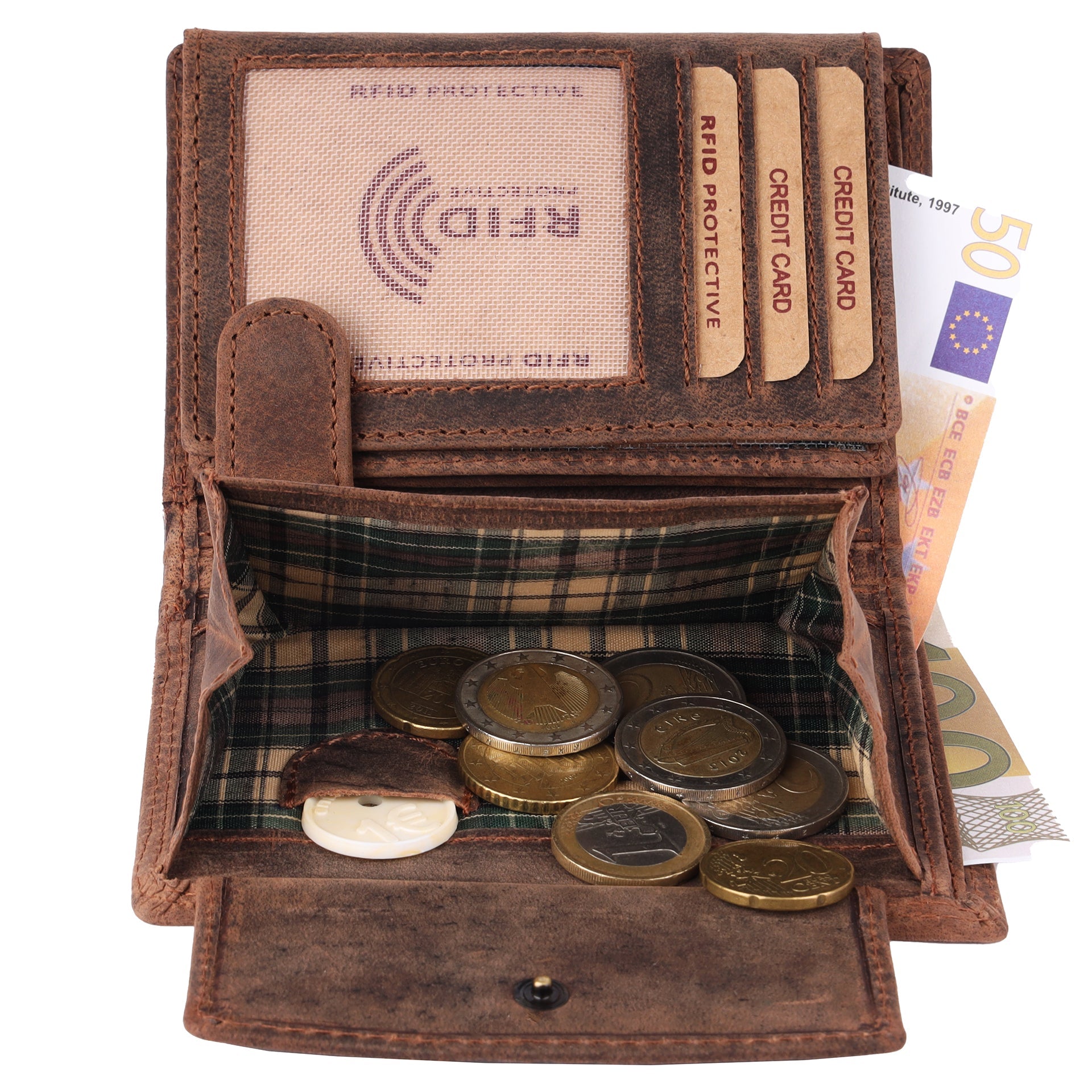 · Herren-Geldbörse - Sehr angenehmes weiches Leder, ein Tolles Material im leichten Vintage-Look. Ein echt hochwertiges Portemonnaie - durch das Langlebige Echt Leder werden Sie den unterschied fühlen. Inklusive RFID-Schutz ist die Börse sicher gegen Datenraub.